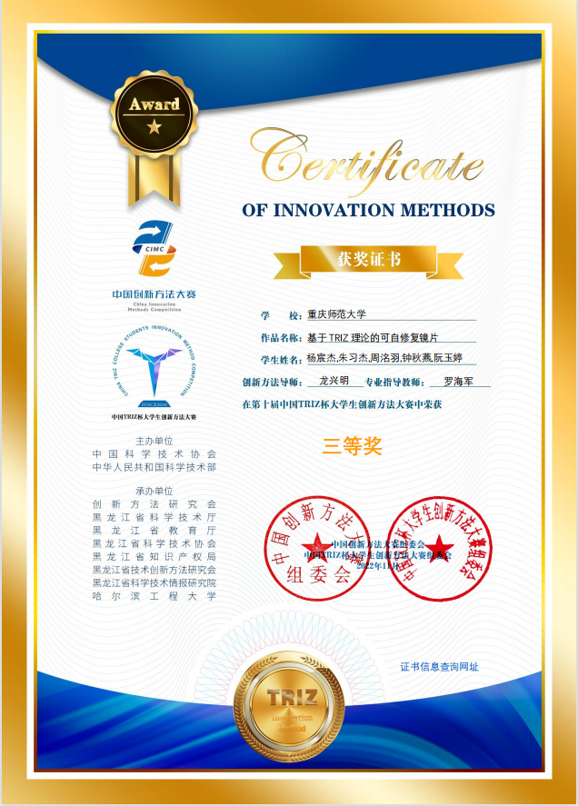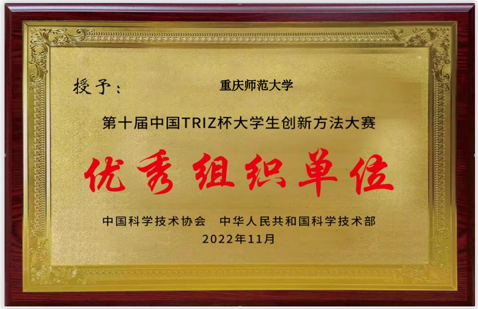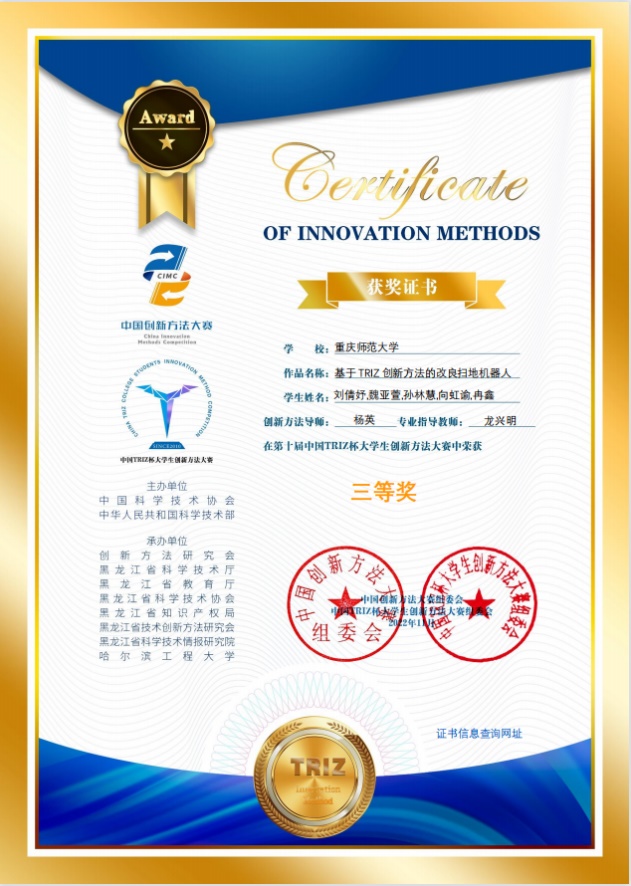 物理与电子工程学院学生刘倩妤、杨宸杰等两个团队获得重庆市一等奖(晋级国家级比赛);冯秀亮、王康宇、任柏年、黄静怡等四个团队获二等奖;赵之瑞、陈桂馨、张佳雯、王莹莹、吴雨航、洪敏等六个团队获三等奖;学校被授予“重庆市triz创新方法比赛优秀组织单位”,杨英和龙兴明两位老师被评为重庆市级比赛优秀指导教师。晋级参与国家级比赛的两支参赛队伍,均获得三等奖,学校被科技部授予“第十届中国triz大学生创新方法大赛”优秀组织单位;杨英老师被评为“第十届中国triz大学生创新方法大赛”优秀联络员。