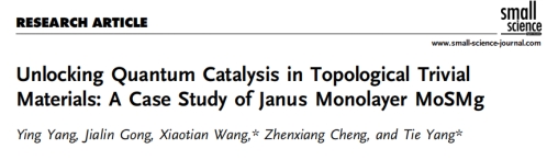 近日,物理与电子工程学院杨英教授关于拓扑催化材料的研究工作以新莆京游戏大厅官方入口为第一单位在《Small Science》上发表题为“Unlocking Quantum Catalysis in Topological Trivial Materials: A Case Study of Janus Monolayer MoSMg”的最新研究成果。《Small Science》是WILEY在2021年最新推出的纳米领域开放获取顶尖旗舰期刊,最新影响因子为11.1。《Small Science》旨在成为大科学时代国际高质量的跨学科科研技术交流平台,致力于报道来自纳米科学和纳米技术各个领域最具影响力的研究成果。