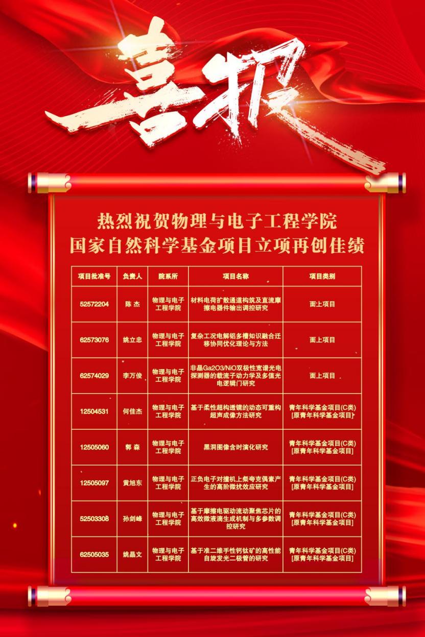 近日,国家自然科学基金委公布了2025年国家自然科学基金集中接收申请项目的评审结果,物理与电子工程学院获批8项国家自然科学基金项目(面上项目3项、青年项目5项),获批总项数在全校各教学科研单位中连续三年位列第一。
